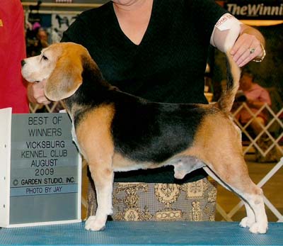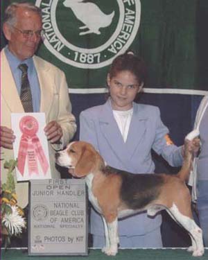 "Kate" received a 5 pt major and then a 4pt major and is now an American Champion.She was bred by and co-owned with John and Laura Law of LongLake Beagles in WA.